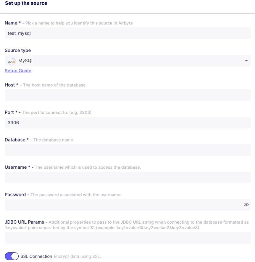 - Source TYPE 선택 후 접속정보 채워넣기.