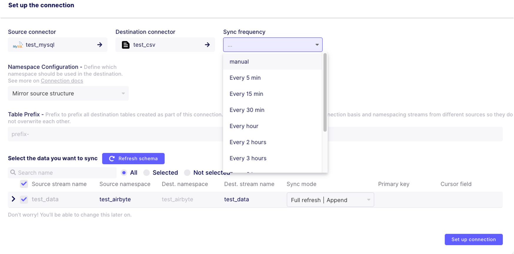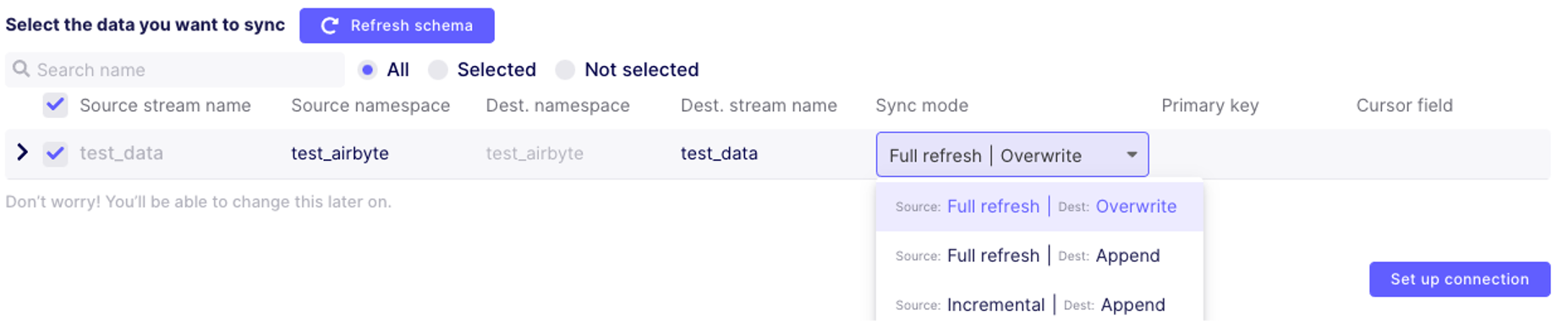 - Sync mode 설정 Sync mode에는 full refresh:overwrite, refresh:append, Incremental:Append 가있는데 Incremental:Append 에는 증분해서 가져올 primary key가 지정이 되어 있어야 하는것 같다. 이번에는 테스트이기 때문에 overwrite하도록한다.
