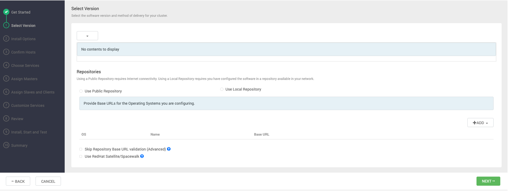 - 설치 가능한 Stack이 없기 때문에 설치가 불가능하다 그래서 아까 설치했던 bigtop-mpack을 추가 설치 한다.