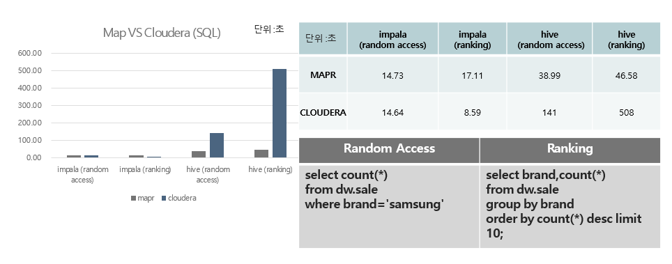 - Impala에서 Random Access는 MAPR 과 CLOUDERA 모두 비슷한 성능을 내었지만 ranking을 구하는 쿼리에서는 CLOUDERA가 더 높은 성능을 냈습니다.