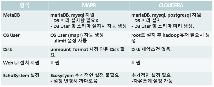- MAPR은 Ecosystem의 개별적인 설정이 불필요하여 설치 후 간단하게 사용할 수 있지만 세부 설정이 어려운 단점이 존재하며 -CLOUDERA는 Ecosysyem 개별 설정이 가능한 페이지가 존재하여 Web 에서 설정 가능.