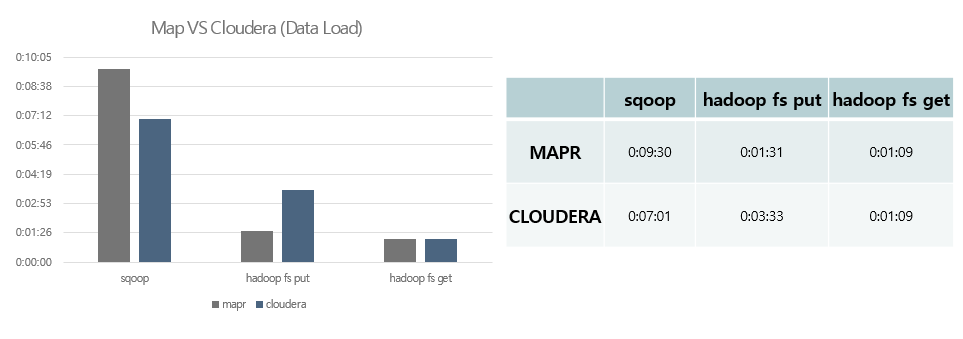 - MAPR은 Hadoop 파일 시스템에 데이터를 올리는 put 명령어는 빠른 성능을 보이지만 데이터를 내려 받는 get 명령어는 비슷, Sqoop은 CLOUDERA가 우세한 성능을 보여줬습니다.